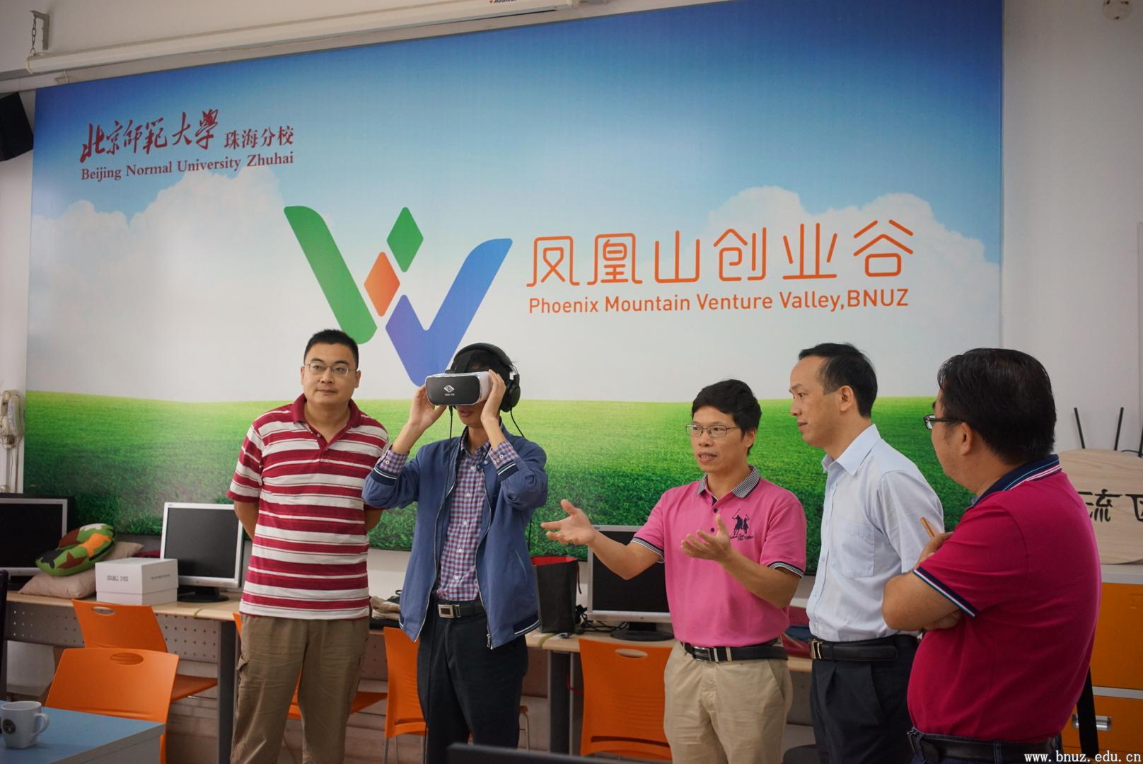 创业谷入驻企业灰谷科技的技术负责人高升经理请王旭主任戴上了他们自主开发的VR智能教室3D眼镜,体验足不出户就能利用增强现实技术,身临其境地学习新型学习模式。高升介绍,该项目已与教育企业对接并上线使用。