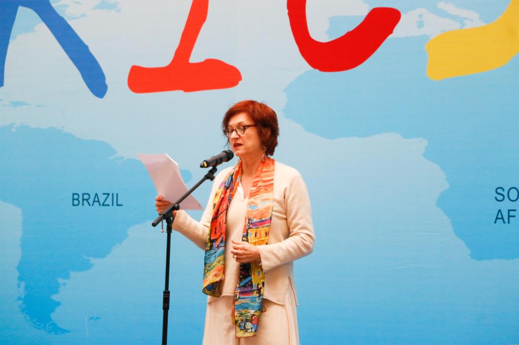 巴西著名诗人、前外交官玛丽亚·露西娅·威尔第首先登台,她用中文表达了来到珠海分校的欣喜,并用顿挫有致的声调深情朗诵诗歌《线》、《时间的凝视》、《圣保罗》、《承德三叠》。她的朗诵展现出其对祖国的热爱和对巴西贫苦人民的同情,热情的声调不乏对人性的思考,以及对巴西未来的展望。