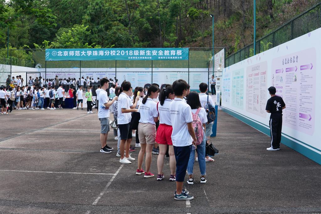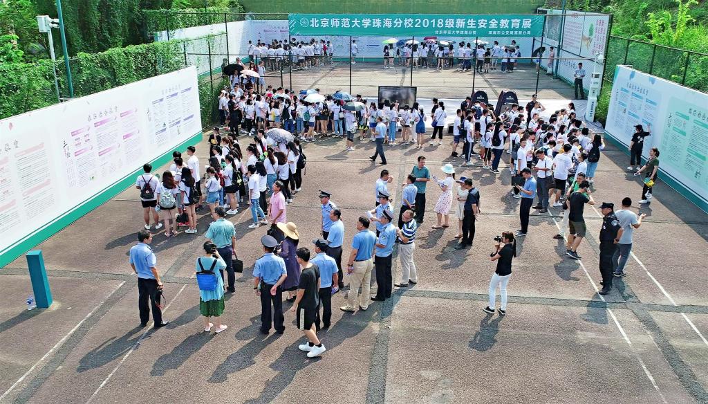 本网讯(通讯员 郭妮皎)9月4日下午,北京师范大学珠海分校2018级新生安全教育展顺利开展,第一批新生1510人参加活动。珠海市公安局高新分局、珠海市教育局安保科、高新区教育局、珠海市国保大队、高新区综治局平安办,以及高新区的兄弟院校北理工、UIC、中大的领导和嘉宾来到观场观摩指导。我校党委书记耿向东、党委副书记金洋出席活动。