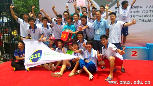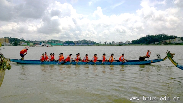In this year’s tournament, a team of 26 BNUZ students, all from School of Sports and Leisure, made their debut. This is their first time to join such splendid dragon boat game. With unremitting efforts, the BNUZ team ranked No.1 among all university teams and No. 6 among all 17 teams with a score of 3 min 37 sec. 42. After the competition, Wang Zhao, team member of BNUZ Dragon Boat expressed his excitement about the final result in an interview, saying his wishes to continue the game next year. Prof. Zhong Yong and Prof. Zhao Shunlai, Dean and Deputy Dean of School of Sports and Leisure also came to the competition field to cheer up.