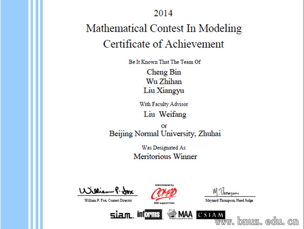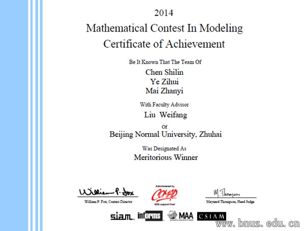 The 2014 MCM/ ICM (The Mathematical Contest in Modeling/The Interdisciplinary Contest in Modeling) for Sino-U.S. students was held successfully recently. There are altogether 26 teams from BNUZ participated in the contests after selection and the teams are consisted of 78 students from the School of Applied Mathematics, International Business Faculty, School of Engineering Technology, School of Information Technology, and School of Management.